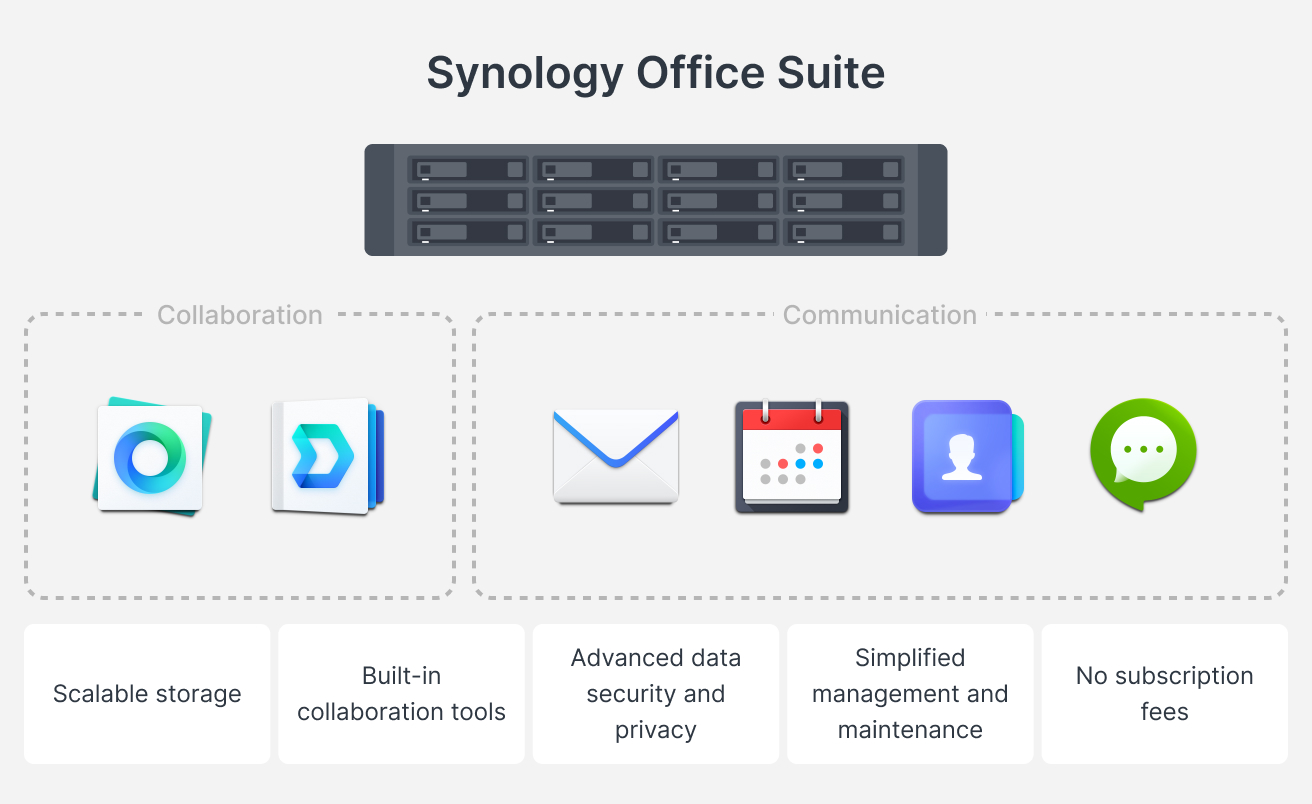 เร็กซ์ หวง กล่าวเพิ่มเติมว่า เพื่อตอบสนองต่อการเปลี่ยนแปลงของสถาบันการศึกษาให้สามารถหันไปใช้ชุดประสิทธิภาพการทำงานที่แบบ on-premise บริษัท มีบริการ Synology Office Suite สำหรับสถาบันการศึกษา ซึ่งมีความยืดหยุ่นในการจัดเก็บข้อมูล ให้ความปลอดภัยแก่ข้อมูลเพื่อปฏิบัติตามกฎหมาย และยังช่วยลดต้นทุน มากไปกว่านั้น ยังช่วยเสริมสร้างการทำงานร่วมกันและการสื่อสารด้วยเครื่องมือแบบครบวงจรเช่น Synology Drive, Office, MailPlus, Chat, Calendar, Contacts และ NoteStation เครื่องมือเหล่านี้มีฟีเจอร์ที่ช่วยนักเรียน อาจารย์ และคุณครู จัดการไฟล์ทำงานได้ง่ายและให้ข้อมูลปลอดภัยมากยิ่งขึ้น เช่น การจัดเก็บไฟล์อย่างปลอดภัย การกำหนดสิทธิ์การแชร์ที่ละเอียด การแก้ไขเอกสารแบบเรียลไทม์ และการส่งข้อความ
