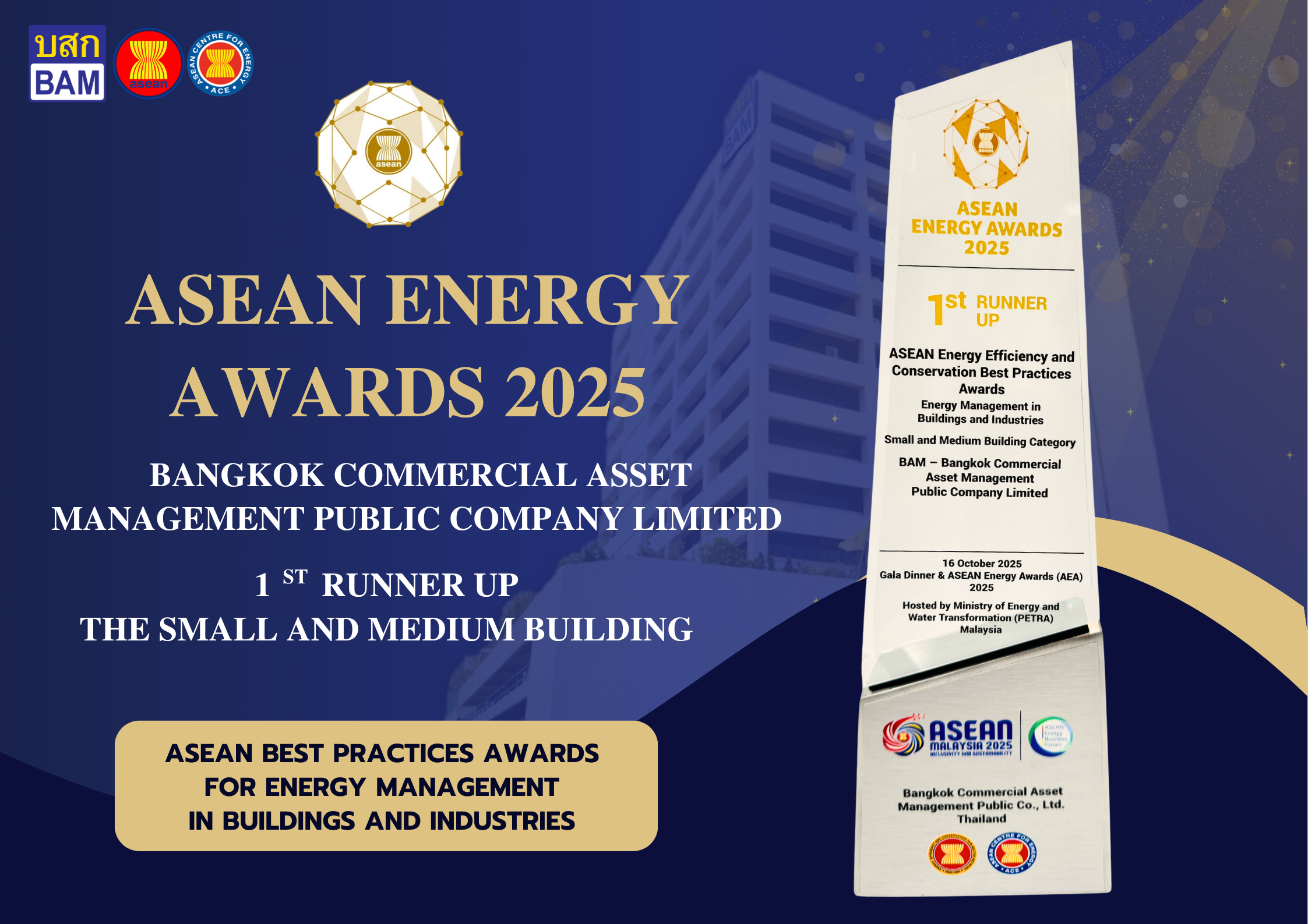 บริษัท บริหารสินทรัพย์ กรุงเทพพาณิชย์ จำกัด (มหาชน) หรือ BAM คว้ารางวัลด้านพลังงานระดับอาเซียน ได้รับรางวัลรองชนะเลิศอันดับ 1 ด้านการบริหารจัดการอาคารดีเด่นในอาคารและโรงงานอุตสาหกรรม ( ASEAN Best Practices Awards for Energy Management in Buildings and Industries ) ประเภทอาคารขนาดเล็กและขนาดกลาง ( Small and Medium Building Category ) จากเวที ASEAN Energy Awards 2025
