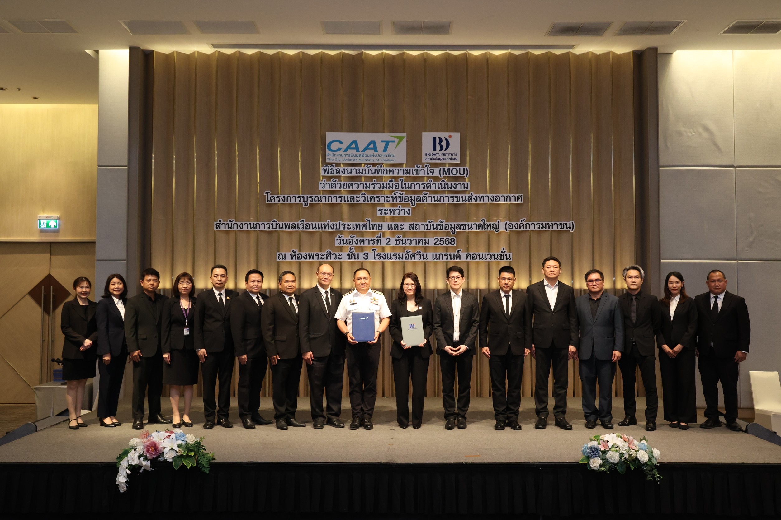 วันที่ 2 ธันวาคม 2568 สำนักงานการบินพลเรือนแห่งประเทศไทย (CAAT) นำโดย พลอากาศเอก มนัท ชวนะประยูร ผู้อำนวยการฯ พร้อมด้วยนายศรัณย เบ็ญจนิรัตน์ รองผู้อำนวยการสายงานพัฒนาเศรษฐกิจการบิน และสถาบันข้อมูลขนาดใหญ่ (องค์การมหาชน) (BDI) นำโดยศาสตราจารย์ ดร.ธีรณี อจลากุล ผู้อำนวยการฯ และนายสุธี อุไรวิชัยกุล รองผู้อำนวยการกลุ่มงานบูรณาการและวิเคราะห์ข้อมูล ร่วมลงนามบันทึกความเข้าใจ (MOU) “โครงการบูรณาการและวิเคราะห์ข้อมูลด้านการขนส่งทางอากาศ” เพื่อพัฒนาระบบข้อมูลกลางด้านการบินของประเทศไทยให้มีความทันสมัย โปร่งใส และใช้ประโยชน์ได้จริงในทุกมิติ