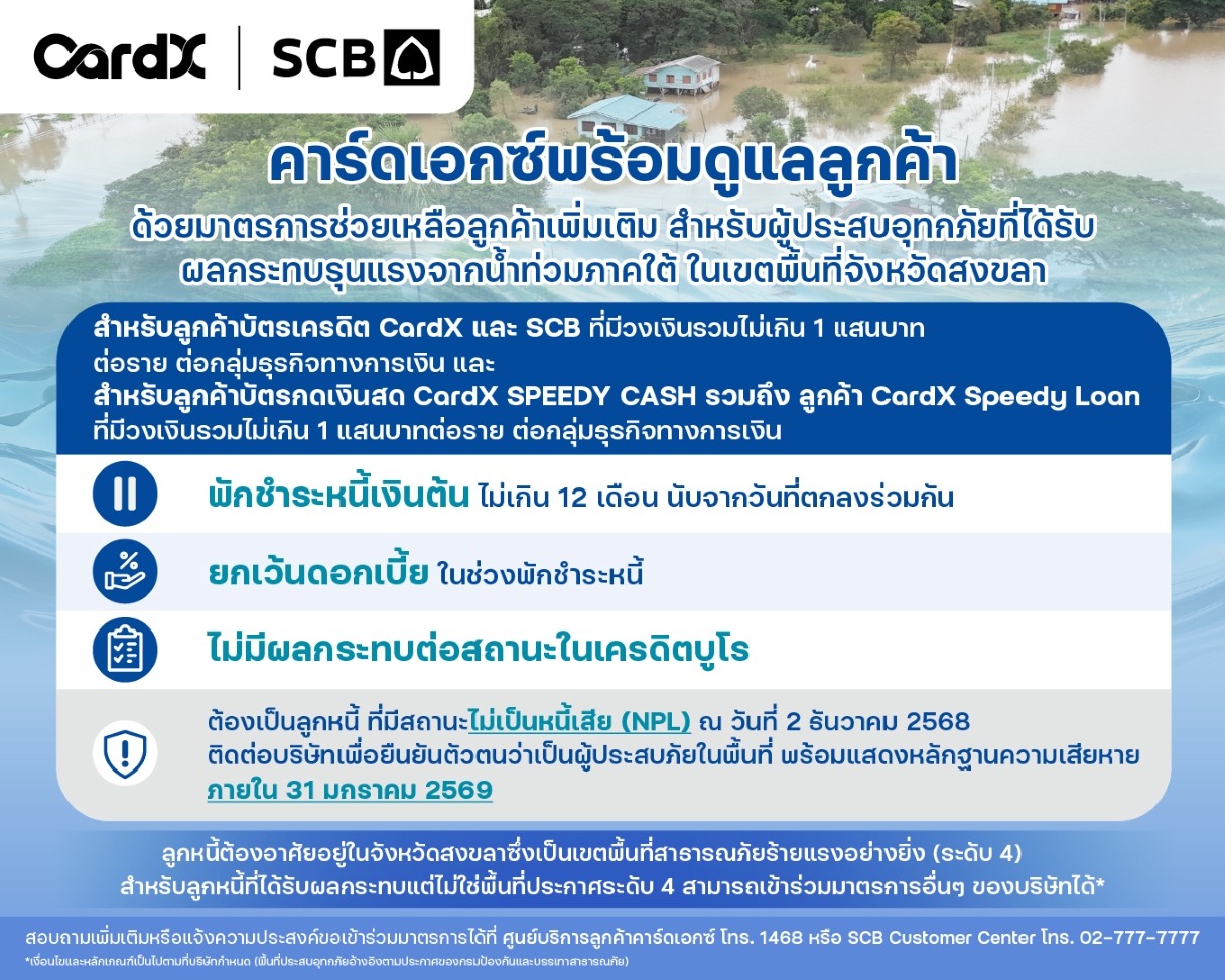 โดยลูกค้าสามารถติดต่อขอเข้าร่วมมาตรการ เพื่อยืนยันตัวตนว่าเป็นผู้ประสบภัยในพื้นที่ พร้อมแสดงหลักฐานความเสียหาย ภายใน 31 มกราคม 2569 ได้ที่ ศูนย์บริการลูกค้าคาร์ดเอกซ์ โทร.1468 หรือ SCB Customer Center โทร 02-777-7777