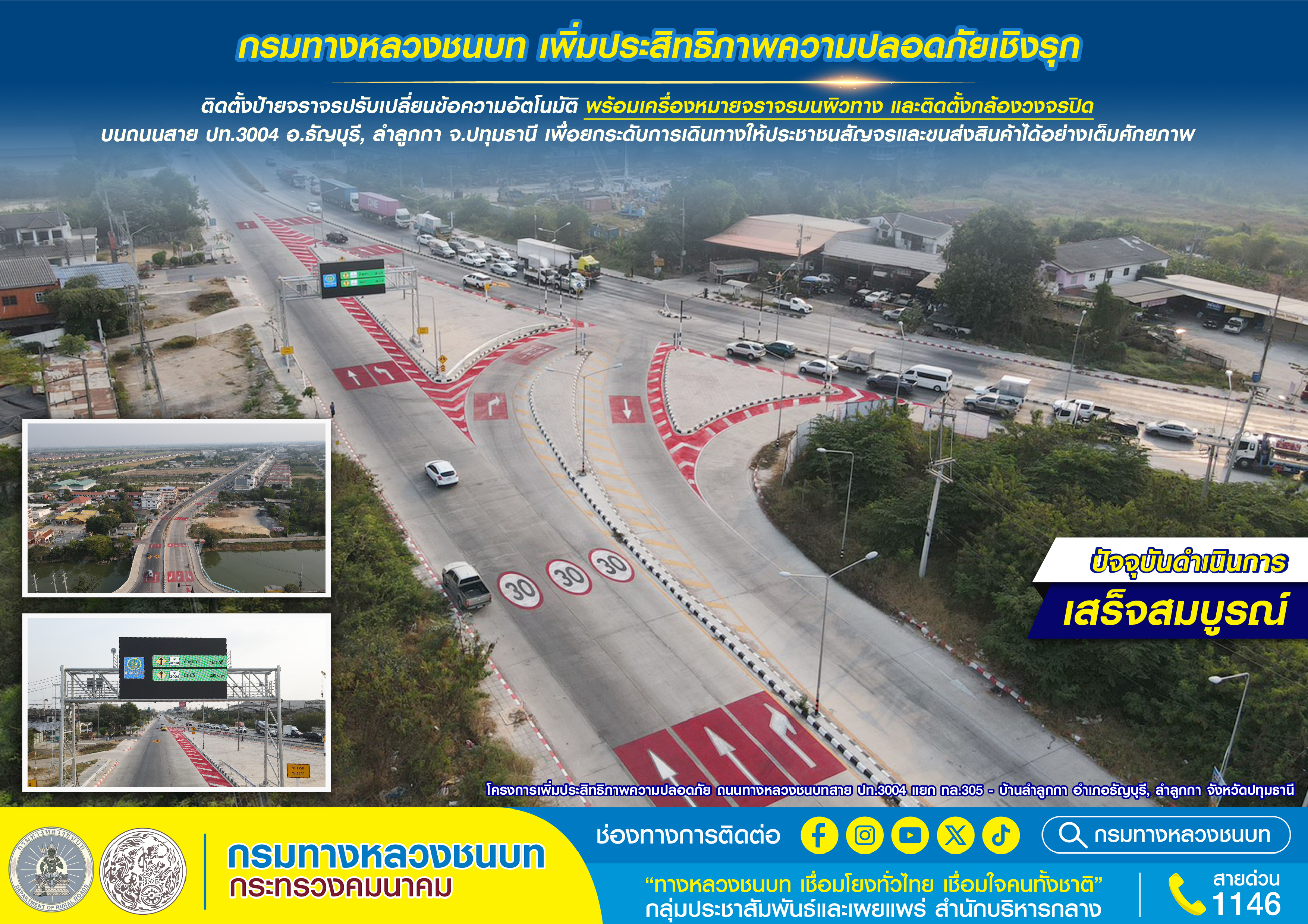 กรมทางหลวงชนบท ลุยยกระดับความปลอดภัยเชิงรุก ติดป้ายอัจฉริยะ–CCTV ถนน ปท.3004 ปทุมธานี ยกระดับการเดินทาง และขนส่งสินค้า